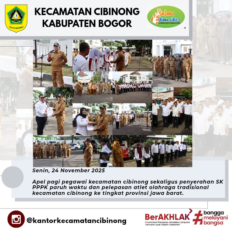 Apel pagi pegawai Kecamatan Cibinong sekaligus penyerahan SK PPPK paruh waktu dan pelepasan atlet olahraga tradisional Kecamatan Cibinong ke tingkat provinsi jawa barat.
