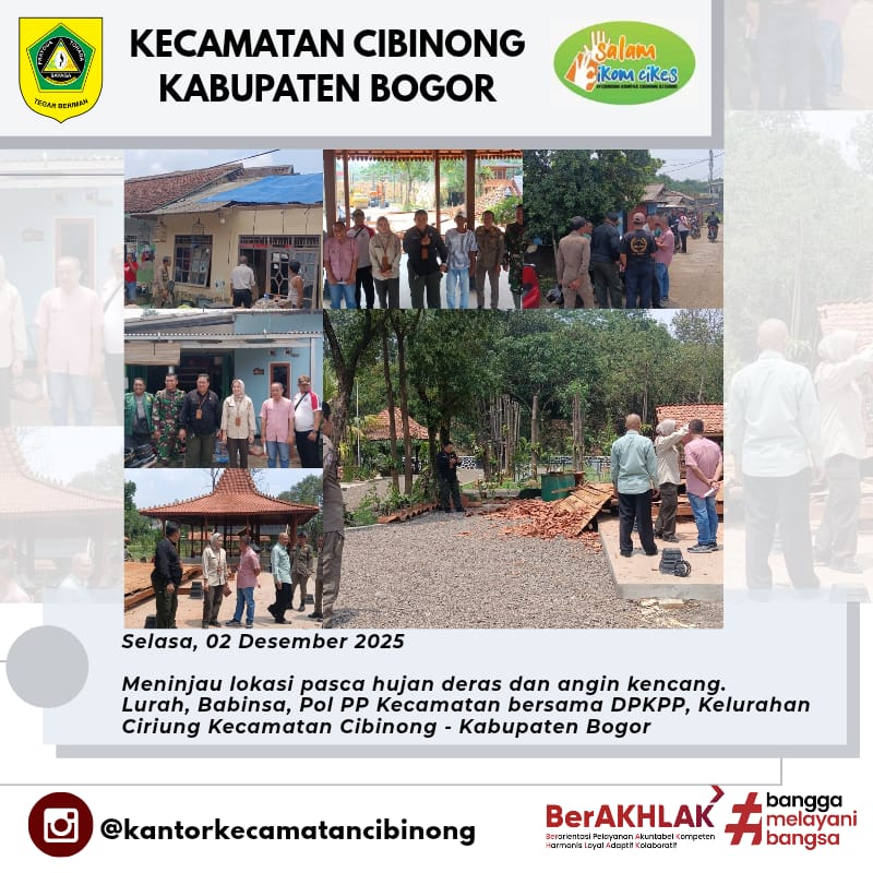 Meninjau lokasi pasca hujan deras dan angin kencang.Lurah,Babinsa,Pol PP Kecamatan bersama DPKPP, Kelurahan Ciriung Kecamatan Cibinong - Kabupaten Bogor