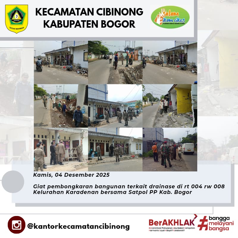Giat pembongkaran bangunan terkait drainase di rt 004 rw 008 Kelurahan Karadenan bersama satpol PP Kab. Bogor